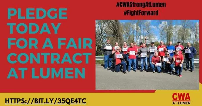 CWA District 7 members at Lumen (formerly known as CenturyLink) are mobilizing to prepare for bargaining their next contract, which expires in less than a year. The workers have launched an “I’m All In For A Fair Contract” Pledge Card Campaign. Members have been engaging by signing the pledge, wearing red, and building solidarity through online actions.