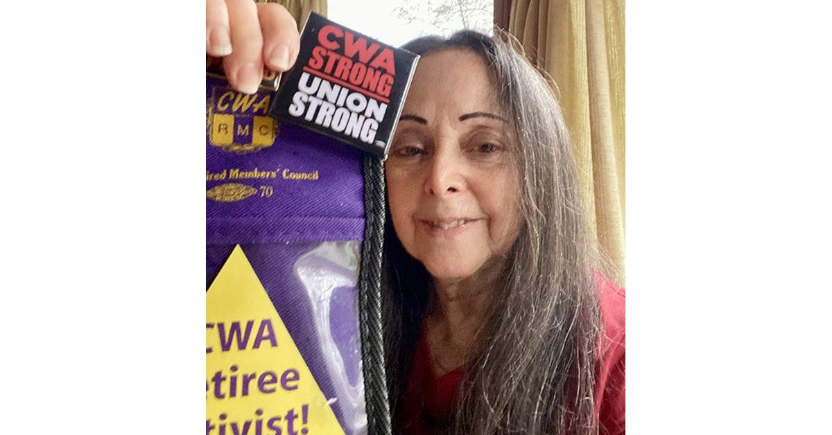 Media Sector President of the CWA Retired Members Council, TNG-CWA RMC Chapter 31003 President, and TNG-CWA Retiree Coordinator Myra Kreiman posed proudly with her CWA Retiree Activist badge.